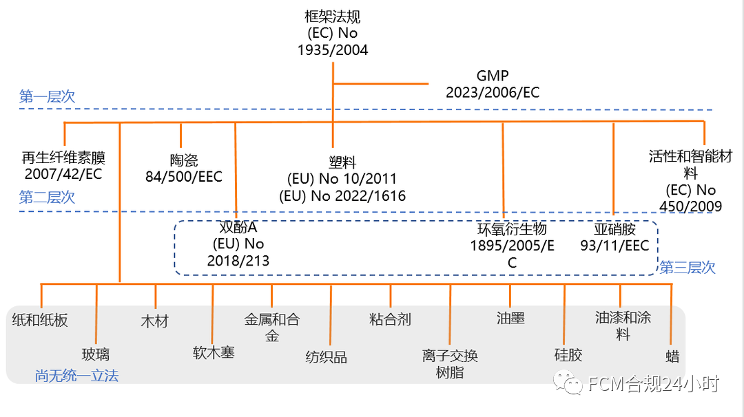 第一层次为一般立法,包含框架法规(EC)No 1935/2004和关于良好生产规范(GMP)的(EC)No 2023/2006法规。
